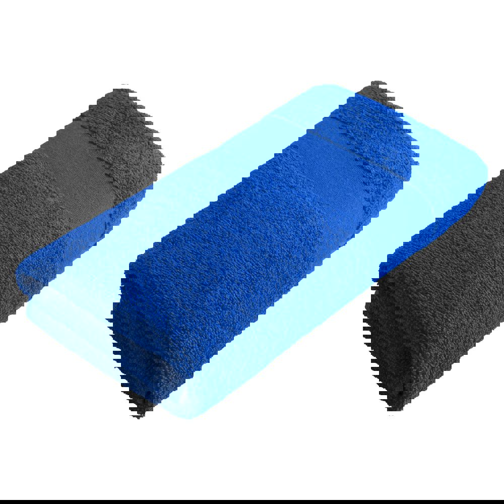Size: 100 × 50 cm. Weight: 360 g/m². Material: ring-spun cotton terry. Finish: single 6 cm border. Feel: soft terry loop, suitable for repeated use. Colours: White, Black, Navy, Red, Cobalt Blue. Personalisation: embroidery or print, depending on design. Minimum order applies. Typical packing: bulk folded.