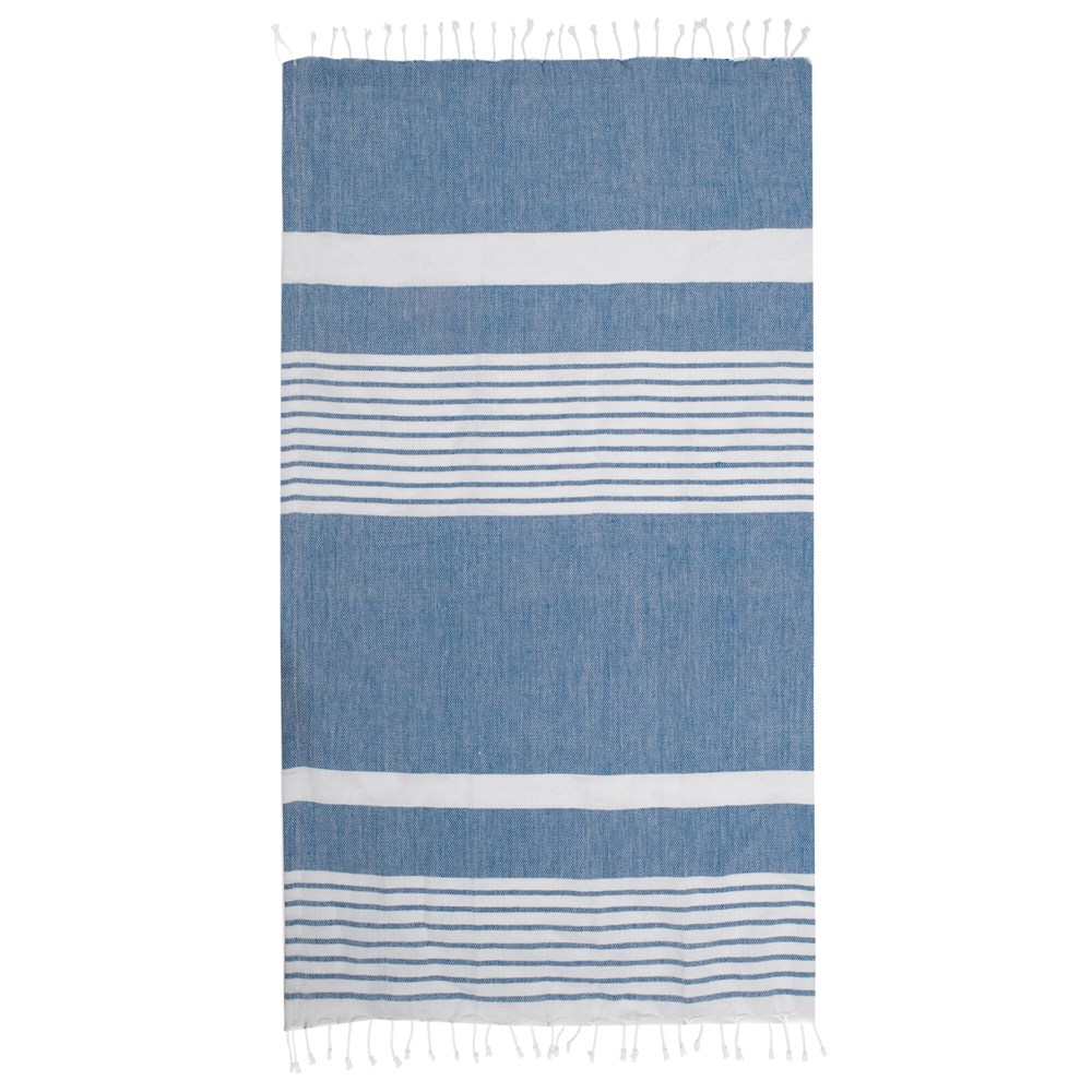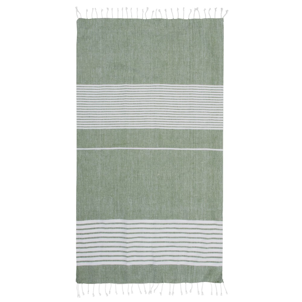 Size: 145 x 250 cm. Material: 70% recycled cotton, 30% polyester. Thin woven construction with Sagaform stripe pattern. Quick-drying and lightweight. Compact when rolled; easy to hang. Multi-purpose: towel, throw, picnic blanket, or tablecloth. Supplied in a cardboard sleeve. Colors: Blue, Grey, Yellow, Green. Suitable for printing or embroidery with your logo. Intended for business clients, associations, and events. Variable product with color options.