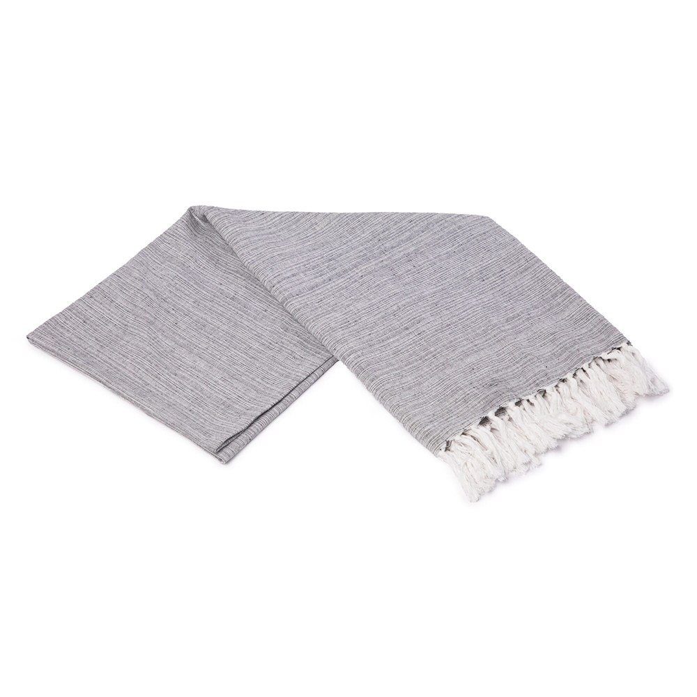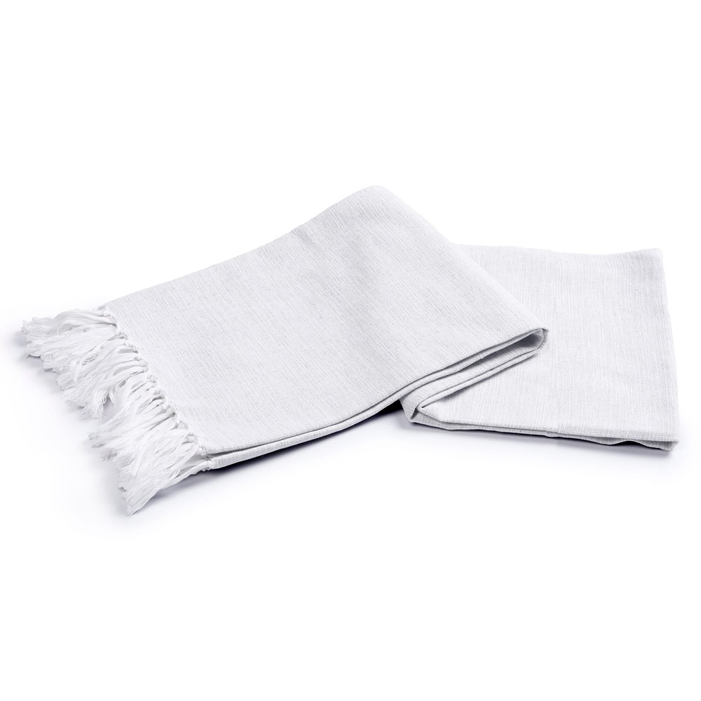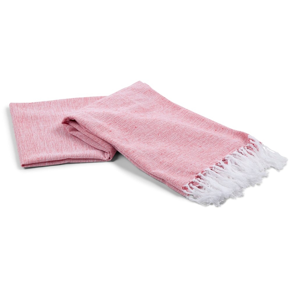 Dimensions: 150 × 90 cm. Material: 70% recycled cotton. Weave: flat‑woven with fringed edges. Look: melange effect from coloured yarns blended with white. Colours: dark grey, light blue, light grey, light green, light red. Product type: variable product with colour options. Personalisation: print or embroidery with your logo. Care: machine washable; detailed care guidance available on request.