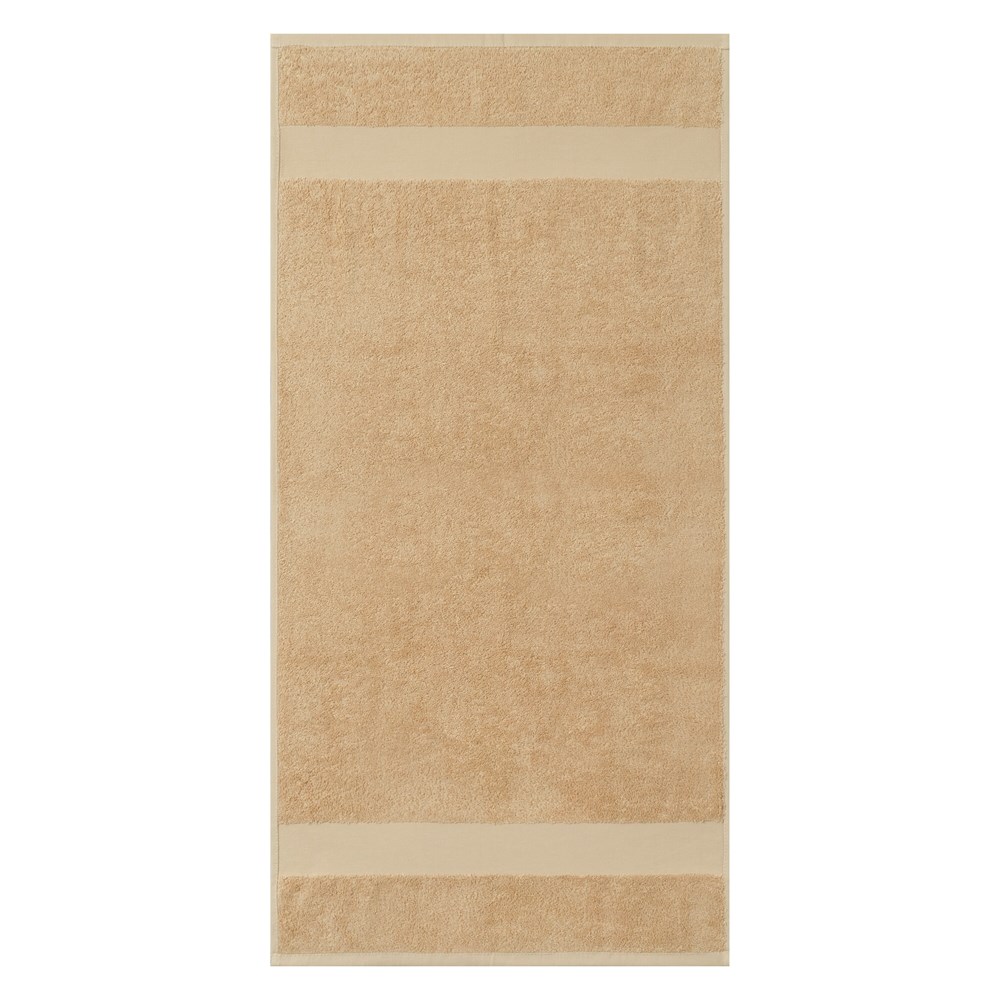 Formaat: 100 × 50 cm. Gewicht: 500 g/m². Materiaal: 100% biologisch katoen met zachte lussen. Afwerking: twee 6 cm hoge banden voor strakke personalisatie. Toepassing: sport, wellness en dagelijks gebruik. Kleuren: Wit, Zwart, Donkergrijs, Navy, Denim, Khaki.